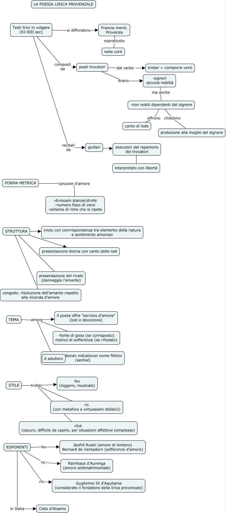 Questa Cmap, creata con IHMC CmapTools, contiene informazioni relative a: 7_ La lirica provenzale, ESPONENTI in Italia Cielo d'Alcamo, Testi lirici in volgare (XI-XIII sec) recitati da giullari, STILE trobar ric (con metafore e virtuosismi stilistici), Francia merid. Provenza soprattutto nelle corti, TEMA amore è adultero, STRUTTURA ???? congedo: risoluzione dell'amante rispetto alla vicenda d'amore, -non nobili dipendenti del signore offrono canto di lode, STRUTTURA ???? presentazione donna con canto delle lodi, FORMA METRICA canzone d'amore -divisoain stanze/strofe -numero fisso di versi -schema di rime che si ripete, ESPONENTI clu Guglielmo IX d'Aquitania (considerato il fondatore della lirica provenzale), esecutori del repertorio dei trovatori ???? interpretato con libertà, STILE trobar clus (oscuro, difficile da capire, per situazioni affettive complesse), Testi lirici in volgare (XI-XIII sec) si diffondono Francia merid. Provenza, poeti trovatori erano -signori -piccola nobiltà, TEMA amore -fonte di gioia (se corrisposto) motivo di sofferenza (se rifiutato), Testi lirici in volgare (XI-XIII sec) composti da poeti trovatori, STRUTTURA ???? presentazione del rivale (danneggia l'amante), poeti trovatori dal verbo trobar = comporre versi, TEMA amore il poeta offre "servizio d'amore" (lodi e devozione), STRUTTURA ???? inizio con conrrispondenza tra elemento della natura e sentimento amoroso