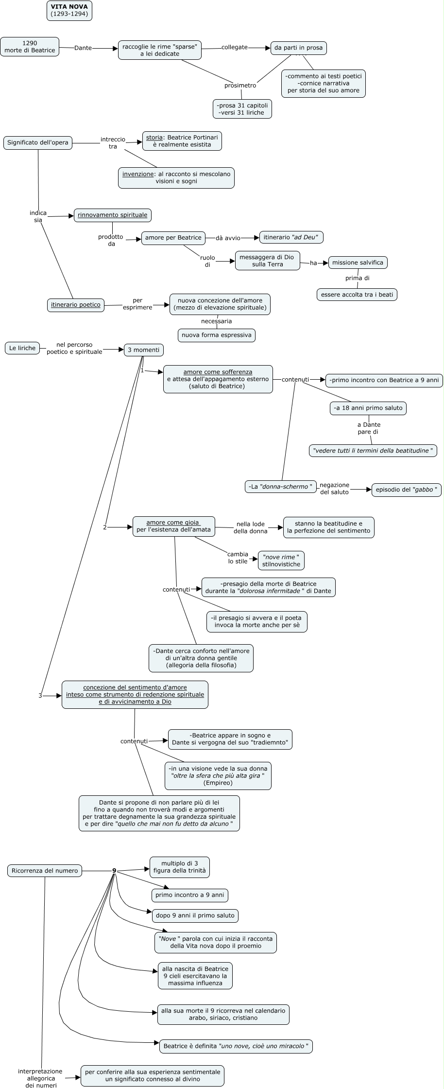 Questa Cmap, creata con IHMC CmapTools, contiene informazioni relative a: 1_Vita Nova, amore come gioia per l'esistenza dell'amata contenuti -presagio della morte di Beatrice durante la "dolorosa infermitade" di Dante, raccoglie le rime "sparse" a lei dedicate collegate da parti in prosa, amore come sofferenza e attesa dell'appagamento esterno (saluto di Beatrice) contenuti -La "donna-schermo", 3 momenti 2 amore come gioia per l'esistenza dell'amata, Significato dell'opera intreccio tra storia: Beatrice Portinari è realmente esistita, missione salvifica prima di essere accolta tra i beati, Ricorrenza del numero 9 Beatrice è definita "uno nove, cioè uno miracolo", concezione del sentimento d'amore inteso come strumento di redenzione spirituale e di avvicinamento a Dio contenuti Dante si propone di non parlare più di lei fino a quando non troverà modi e argomenti per trattare degnamente la sua grandezza spirituale e per dire "quello che mai non fu detto da alcuno", da parti in prosa prosimetro -prosa 31 capitoli -versi 31 liriche, Ricorrenza del numero 9 "Nove" parola con cui inizia il racconta della Vita nova dopo il proemio, amore per Beatrice ruolo di messaggera di Dio sulla Terra, Ricorrenza del numero 9 primo incontro a 9 anni, concezione del sentimento d'amore inteso come strumento di redenzione spirituale e di avvicinamento a Dio contenuti -Beatrice appare in sogno e Dante si vergogna del suo "tradiemnto", raccoglie le rime "sparse" a lei dedicate prosimetro -prosa 31 capitoli -versi 31 liriche, concezione del sentimento d'amore inteso come strumento di redenzione spirituale e di avvicinamento a Dio contenuti -in una visione vede la sua donna "oltre la sfera che più alta gira" (Empireo), Significato dell'opera intreccio tra invenzione: al racconto si mescolano visioni e sogni, Ricorrenza del numero 9 alla sua morte il 9 ricorreva nel calendario arabo, siriaco, cristiano, Le liriche nel percorso poetico e spirituale 3 momenti, rinnovamento spirituale prodotto da amore per Beatrice, 3 momenti 1 amore come sofferenza e attesa dell'appagamento esterno (saluto di Beatrice)