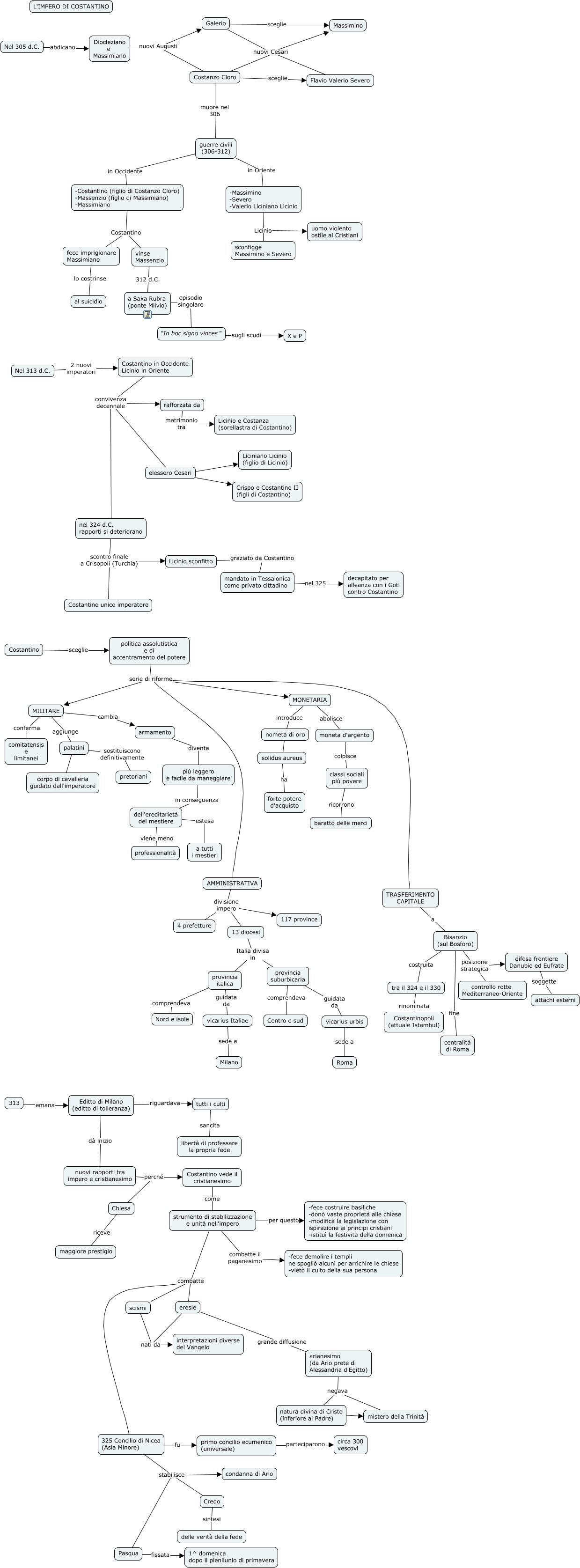 Questa Cmap, creata con IHMC CmapTools, contiene informazioni relative a: Costantino, "In hoc signo vinces" sugli scudi X e P, politica assolutistica e di accentramento del potere serie di riforme TRASFERIMENTO CAPITALE, nuovi rapporti tra impero e cristianesimo perché Chiesa, TRASFERIMENTO CAPITALE a Bisanzio (sul Bosforo), elessero Cesari ???? Liciniano Licinio (figlio di Licinio), Costantino in Occidente Licinio in Oriente convivenza decennale rafforzata da, nometa di oro ???? solidus aureus, eresie grande diffusione arianesimo (da Ario prete di Alessandria d'Egitto), guerre civili (306-312) in Occidente -Costantino (figlio di Costanzo Cloro) -Massenzio (figlio di Massimiano) -Massimiano, strumento di stabilizzazione e unità nell'impero combatte il paganesimo -fece demolire i templi ne spogliò alcuni per arrichire le chiese -vietò il culto della sua persona, Costantino sceglie politica assolutistica e di accentramento del potere, arianesimo (da Ario prete di Alessandria d'Egitto) negava natura divina di Cristo (inferiore al Padre), eresie nati da interpretazioni diverse del Vangelo, vicarius Italiae sede a Milano, AMMINISTRATIVA divisione impero 4 prefetture, 325 Concilio di Nicea (Asia Minore) stabilisce condanna di Ario, Galerio nuovi Cesari Flavio Valerio Severo, provincia suburbicaria comprendeva Centro e sud, 13 diocesi Italia divisa in provincia suburbicaria, a Saxa Rubra (ponte Milvio) episodio singolare "In hoc signo vinces"