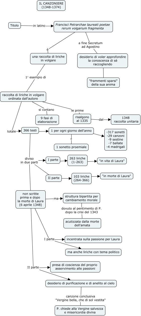 Questa Cmap, creata con IHMC CmapTools, contiene informazioni relative a: 3_Canzoniere, struttura bipartita per cambiamento morale dovuto al pentimento di P. dopo la crisi del 1343 acutizzata dalla morte dell'amata, Francisci Petrarchae laureati poetae rerum volgarium fragmenta a fine Secretum ad Agostino desiderio di voler approfondire la conoscenza di sè raccogliendo, 366 testi ???? 1 per ogni giorno dell'anno, desiderio di voler approfondire la conoscenza di sè raccogliendo ???? "frammenti sparsi" della sua anima, 103 liriche (264-366) ???? "in morte di Laura", 1 per ogni giorno dell'anno + 1 sonetto proemiale, non scritte prima e dopo la morte di Laura (6 aprile 1348) ma struttura bipartita per cambiamento morale, raccolta di liriche in volgare ordinata dall'autore totale 366 testi, raccolta di liriche in volgare ordinata dall'autore si contano 9 fasi di elaborazione, una raccolta di liriche in volgare 1° esempio di raccolta di liriche in volgare ordinata dall'autore, 366 testi diviso in due parti II parte, 366 testi diviso in due parti I parte, II parte ???? 103 liriche (264-366), 263 liriche (1-263) ???? "in vita di Laura", 1 per ogni giorno dell'anno -317 sonetti -29 canzoni -9 sestine -7 ballate -4 madrigali, desiderio di purificazione e di anelito al cielo canzone conclusiva "Vergine bella, che di sol vestita" P. chiede alla Vergine salvezza e misericordia divina, Francisci Petrarchae laureati poetae rerum volgarium fragmenta è una raccolta di liriche in volgare, I parte ???? 263 liriche (1-263), non scritte prima e dopo la morte di Laura (6 aprile 1348) I parte incentrata sulla passione per Laura, Titolo in latino Francisci Petrarchae laureati poetae rerum volgarium fragmenta