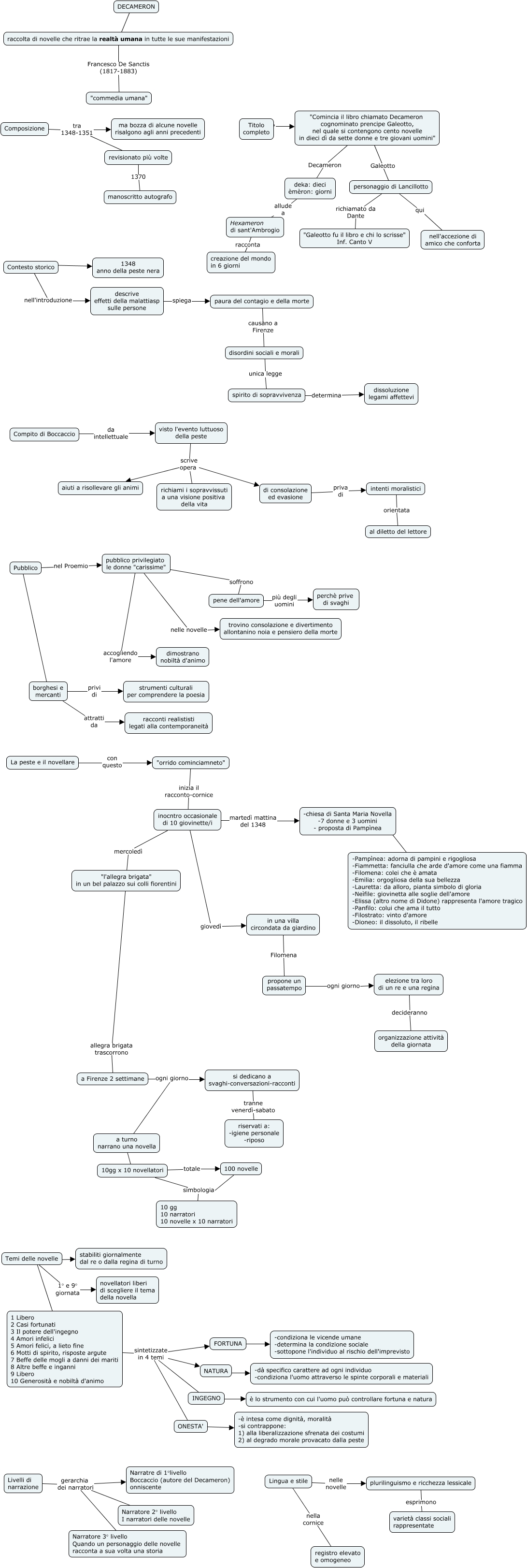 Questa Cmap, creata con IHMC CmapTools, contiene informazioni relative a: Decameron, 1 Libero 2 Casi fortunati 3 Il potere dell'ingegno 4 Amori infelici 5 Amori felici, a lieto fine 6 Motti di spirito, risposte argute 7 Beffe delle mogli a danni dei mariti 8 Altre beffe e inganni 9 Libero 10 Generosità e nobiltà d'animo sintetizzate in 4 temi INGEGNO, personaggio di Lancillotto richiamato da Dante "Galeotto fu il libro e chi lo scrisse" Inf. Canto V, pubblico privilegiato le donne "carissime" soffrono pene dell'amore, pene dell'amore più degli uomini perchè prive di svaghi, 1 Libero 2 Casi fortunati 3 Il potere dell'ingegno 4 Amori infelici 5 Amori felici, a lieto fine 6 Motti di spirito, risposte argute 7 Beffe delle mogli a danni dei mariti 8 Altre beffe e inganni 9 Libero 10 Generosità e nobiltà d'animo sintetizzate in 4 temi ONESTA', INGEGNO ???? è lo strumento con cui l'uomo può controllare fortuna e natura, inocntro occasionale di 10 giovinette/i martedì mattina del 1348 -chiesa di Santa Maria Novella -7 donne e 3 uomini - proposta di Pampìnea, 10gg x 10 novellatori simbologia 10 gg 10 narratori 10 novelle x 10 narratori, visto l'evento luttuoso della peste scrive opera aiuti a risollevare gli animi, deka: dieci èmèron: giorni allude a Hexameron di sant'Ambrogio, elezione tra loro di un re e una regina decideranno organizzazione attività della giornata, 1 Libero 2 Casi fortunati 3 Il potere dell'ingegno 4 Amori infelici 5 Amori felici, a lieto fine 6 Motti di spirito, risposte argute 7 Beffe delle mogli a danni dei mariti 8 Altre beffe e inganni 9 Libero 10 Generosità e nobiltà d'animo sintetizzate in 4 temi FORTUNA, Pubblico ???? borghesi e mercanti, revisionato più volte 1370 manoscritto autografo, 1 Libero 2 Casi fortunati 3 Il potere dell'ingegno 4 Amori infelici 5 Amori felici, a lieto fine 6 Motti di spirito, risposte argute 7 Beffe delle mogli a danni dei mariti 8 Altre beffe e inganni 9 Libero 10 Generosità e nobiltà d'animo sintetizzate in 4 temi NATURA, Contesto storico nell'introduzione descrive effetti della malattiasp sulle persone, pubblico privilegiato le donne "carissime" nelle novelle trovino consolazione e divertimento allontanino noia e pensiero della morte, a Firenze 2 settimane ogni giorno si dedicano a svaghi-conversazioni-racconti, a turno narrano una novella ???? 10gg x 10 novellatori, La peste e il novellare con questo "orrido cominciamneto"