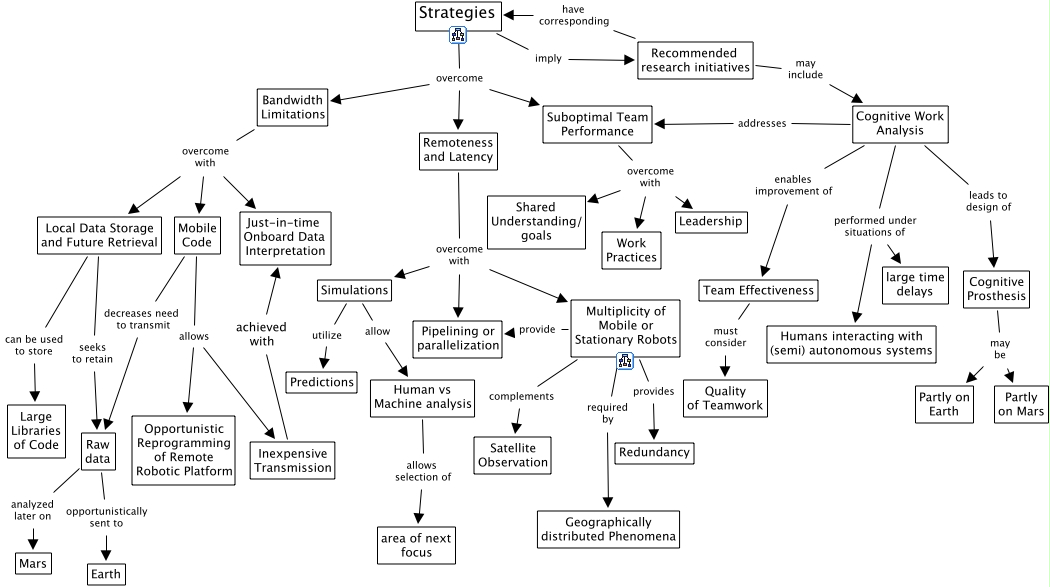 Strategies, Multiplicity of Mobile or Stationary Robots provides Redundancy, Strategies overcome Suboptimal Team Performance, Raw data opportunistically sent to Earth, Human vs Machine analysis allows selection of area of next focus, Mobile Code allows Opportunistic Reprogramming of Remote Robotic Platform, Bandwidth Limitations overcome with Just-in-time Onboard Data Interpretation, Strategies overcome Bandwidth Limitations, Simulations utilize Predictions, Cognitive Work Analysis addresses Suboptimal Team Performance, Strategies imply Recommended research initiatives