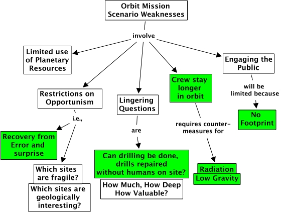 Orbit mission Weaknesses, Orbit Mission Scenario Weaknesses involve Limited use of Planetary Resources, Orbit Mission Scenario Weaknesses involve Lingering Questions, Restrictions on Opportunism i.e., Recovery from Error and surprise, Orbit Mission Scenario Weaknesses involve Crew stay longer in orbit, Lingering Questions are Can drilling be done, drills repaired without humans on site?, Orbit Mission Scenario Weaknesses involve Restrictions on Opportunism, Orbit Mission Scenario Weaknesses involve Engaging the Public, Engaging the Public will be limited because No Footprint, Restrictions on Opportunism i.e., Which sites are fragile?, Crew stay longer in orbit requires counter- measures for Radiation