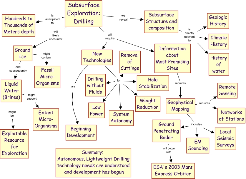 This Concept Map, created with IHMC CmapTools, has information related to: Subsurface Exploration, Subsurface Structure and composition is directly relevant to Geologic History, New Technologies for Low Power, Subsurface Exploration: Drilling will likely encounter Ground Ice, Subsurface Exploration: Drilling will require New Technologies, New Technologies for Weight Reduction, Subsurface Structure and composition is directly relevant to Climate History, Geophysical Mapping requires Remote Sensing, Liquid Water (Brines) might be Exploitable Resource for Exploration, New Technologies are Beginning Development, Subsurface Structure and composition is directly relevant to History of water, New Technologies for System Autonomy, New Technologies for Drilling without Fluids, Subsurface Exploration: Drilling is anticipated to Hundreds to Thousands of Meters depth, Geophysical Mapping includes EM Sounding, Subsurface Exploration: Drilling will require Information about Most Promising Sites, Geophysical Mapping includes Local Seismic Surveys, Geophysical Mapping includes Ground Penetrating Radar, New Technologies for Removal of Cuttings, Ground Penetrating Radar will begin with ESA's 2003 Mars Express Orbiter, Information about Most Promising Sites requires Geophysical Mapping