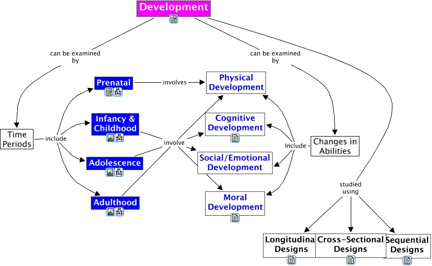 Development Overview, Adulthood involve Cognitive Development, Adulthood involve Physical Development, Infancy & Childhood involve Social/Emotional Development, Development studied using Cross-Sectional Designs, Development studied using Longitudinal Designs, Development can be examined by Time Periods, Changes in Abilities Include Moral Development, Time Periods include Prenatal, Prenatal involves Physical Development, Time Periods include Infancy & Childhood
