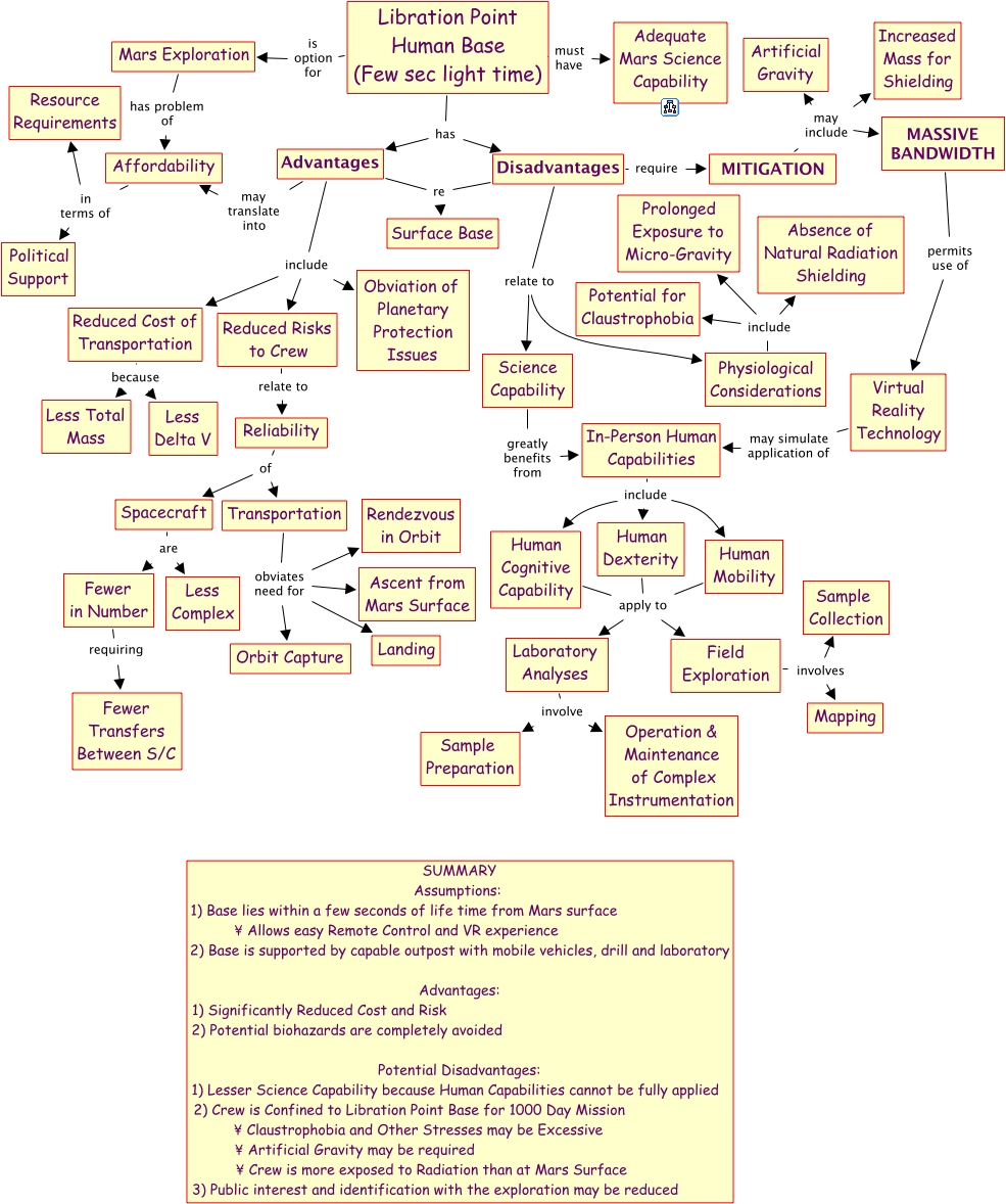 Libration Point Mission, Laboratory Analyses involve Operation & Maintenance of Complex Instrumentation, Field Exploration involves Mapping, Reliability of Transportation, Libration Point Human Base (Few sec light time) is option for Mars Exploration, Reduced Risks to Crew relate to Reliability, Fewer in Number requiring Fewer Transfers Between S/C, Disadvantages relate to Physiological Considerations, Human Dexterity apply to Laboratory Analyses, Human Mobility apply to Laboratory Analyses, Virtual Reality Technology may simulate application of In-Person Human Capabilities