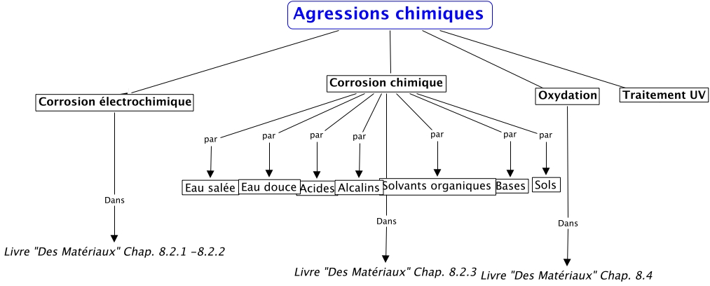 Agressions chimiques, Agressions chimiques Corrosion électrochimique, Corrosion chimique par Alcalins, Agressions chimiques Oxydation, Corrosion électrochimique Dans Livre "Des Matériaux" Chap. 8.2.1 -8.2.2, Corrosion chimique par Acides, Agressions chimiques Corrosion chimique, Corrosion chimique par Solvants organiques, Corrosion chimique Dans Livre "Des Matériaux" Chap. 8.2.3, Corrosion chimique par Sols, Agressions chimiques Traitement UV