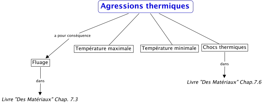 Agressions thermiques, Agressions thermiques Température maximale, Agressions thermiques a pour conséquence Fluage, Fluage dans Livre "Des Matériaux" Chap. 7.3, Agressions thermiques Chocs thermiques, Agressions thermiques Température minimale, Chocs thermiques dans Livre "Des Matériaux" Chap.7.6